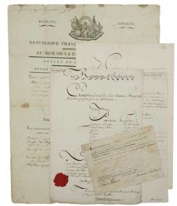 RÉGIMENT ROYAL SUÉDOIS (89ème Infanterie de ligne) 6 pièces au format in folio : Brevet de CHEF DE BATAILLON en partie impr. pour LAFOREST (an 4) à l'en-tête de la Convention Nationale signée griffe de PILLE (Vignette) + Lieutenance pour le Porte Drapeau LAFOREST au 89ème d'Infanterie (1er avril 1791). P.S. du Roi LOUIS XVI (Secrétaire) & Griffe de DUPORTAIL + État des services pour une Lieutenance de HOUPERT au 89ème de ligne (1792) + Lettre signée USSON-BONAC (1724-1782) Diplomate pour le Capitaine NETZEL Royal Suédois. Stockholm 1779 + Quittance sur vélin en partie impr. de 1775 signée Baron SINCLAIR (1720-1803) Général + Lettre signée Général Comte Alexandre de SPARRE (1736-1799) à propos de son Aide de Camp, An 2.