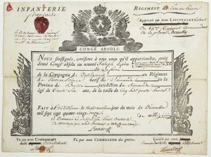 ILE D'OLÉRON (17). ST DOMINGUE. 1791. RÉGIMENT DU PORT AU PRINCE Infanterie. CONGÉ MILITAIRE absolu pour Joseph LEFÈVRE de la Compagnie de Desliguières au Régiment du PORT-AU-PRINCE, natif de Simande, province de Bresse, fait à L'ISLE D'OLÉRON 29 décembre 1791 - Pièce signée DENULLY Lieutenant-Colonel du 84° Régiment Commandant de la Place - Sceau de cire aux armes du Commandant; “Le détachement du Régiment n'étant point muni de cachet...” 1p in-folio, impr. rempli à l'encre.
