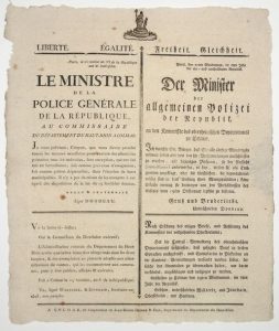 BAS-RHIN. 1798. COLMAR. Adresse de DONDEAU «Le Ministre de la Police générale de la République, au Commissaire du Département du Haut-Rhin, à Colmar. Paris le 25 Ventôse An 6 (15 Mars 1798)» & Réponse de COLMAR le 29 Ventôse An 6. «Vous devez prendre toutes les mesures nécessaires pour exclure des assemblées primaires tous les individus, sans exception, qui ont été mis en surveillance, soit comme prévenus d'émigration, soit comme prêtres déportables...» Imprimerie de Jean-Henri Decker & Fils. Vignette. Placard bilingue (35 x 42), Etat A.