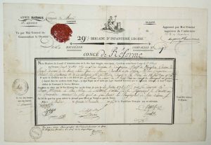 «ARMÉE FRANÇAISE EN BATAVIE». Congé militaire de la 29e ½ Brigade d'Infanterie Légère, signés des Généraux Pierre Antoine DUPONT-CHAUMONT et Jean Nicolas RAZOUT (Comte de l'Empire), fait à BRÉDA (Pays-Bas) le 4 Brumaire An 9 (26 Oct. 1800). Congé de réforme pour blessure au citoyen Joseph VIOLLET, natif de Champlitte (Haute-Saône), brave militaire et bon soldat qui a fait toutes les campagnes de cette guerre. 1page (31,5 x 46), remplie à l'encre. Vignette «Patria». Sceau de cire rouge du Régiment.