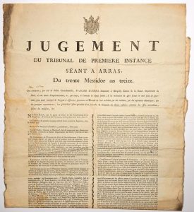 ARRAS (Pas-de-Calais). 1805. CHARLATANISME. «JUGEMENT du Tribunal de première instance séant à ARRAS du 30 Messidor An 13 (19 Juillet 1805), qui condamne... Fiacre DANEL demeurant à MARQUILLY (Nord), à une année d'emprisonnement, et, par corps, à l'amende de vingt francs, à la restitution de 472 francs et aux frais de poursuite, pour avoir escroqué de l'argent à différentes personnes en abusant de leur crédulité par des craintes, par des espérances chimériques, par des pratiques superstitieuses, leur persuadant qu'il possédait l'art prétendu de découvrir les choses cachés, produire des effets merveilleux, défaire les maléfices, & c.» (détails des faits) - Placard (93 x 43). Impr. à ARRAS, chez G.C. Lemaistre Delasablonnière, rue Ernestalle. Vignette Empire.