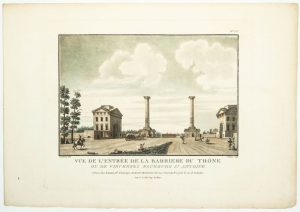 «Vue de l'entrée de LA BARRIERE DU TRÔNE ou de Vincennes Faubourg St Antoine.» Chappuis sculpt. A Paris chez Esnaults, marchand d'Estampes, Boulevard Montmartre. Déposé à la Bibliothèque Impériale en 1807. (29 x 42 cm). Coloris anciens.