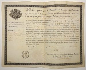 Brevet de Chevalier de SAINT-LOUIS, en faveur du Marquis De LIOUX D'ESTIENNE De CHASSEGROS Ancien Officier - P.S. LOUIS XVIII (de sa griffe) contresigné du Maréchal «Le Duc de FELTRE (CLARKE)» Grand-Maître et fondateur de l'Ordre - Paris 8 Nov. 1815 - Vélin gravé (31 x 40), rempli à l'encre.