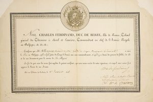 CHARLES-FERDINAND D'ARTOIS, Duc de BERRY (1778-1820) Fils de Charles-Philippe de BOURBON (Futur CHARLES X) Diplôme gravé (32 x 47). Pièce Signée «Charles Ferdinand, duc de BERRY, Fils de France, Colonel Général des Chasseurs à Cheval et Lanciers, Commandant en Chef de l'Armée Royale en Belgique, etc. (Son entête et Vignette gravée.) Certificat pour le Garde du Corps MEZERAY, Compagnie Grammont, qui a suivi le Roi en Belgique (en émigration.) Fait au Château des Tuileries le 1er Janvier 1816. 2 angles réparés.