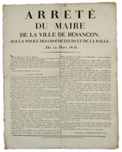 DOUBS. Arrêté du Marquis de TERRIER-SANTANS, Maire de la Ville de BESANÇON, sur la Police des Crocheteurs de la Halle, du 22 Mars 1816 - En 10 articles : La Ville de Besançon délivre à chacun des porte-faix, crocheteurs ou gagne-deniers des médailles en cuivre, ayant en face les armes de la ville, et au revers l'inscription gagne-deniers, avec des numéros d'immatriculation à faire poser sur le brancard de leurs charrettes. De l'Imprimerie de Victor CABUCHET, N° 469. Placard (53 x 42) Etat A