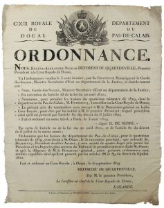 PAS-DE-CALAIS. 1819. COUR ROYALE DE DOUAI (NORD) - Ordonnance de DEFOREST DE QUARTDEVILLE Premier Président à la Cour Royale de DOUAI. - “Nommons pour présider les Assises du 4° trimestre de 1819, dans le Département du Pas-de-Calais, M. DUBROEUCQ Conseiller en la Cour Royale de Douai. - Les Assises du Pas-de-Calais s'ouvriront à ST OMER, le 30 novembre prochain - DOUAI 6 Septembre 1819. Grande vignette royale. Impr. à Douai, chez Wagrez-Taffin, Imprimeur de la Cour Royale. Placard (52 x 41) État A