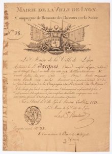 LYON LYON. BATELLERIE. Autorisation du Maire de Lyon, du 1er Juillet 1821, de faire le service de la …