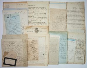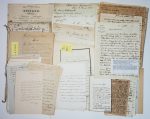 EURE. FAMILLE PASSY & WOLOWSKI. Plus de 270 Lettres et quelques pièces de 1828 à 1878. Fonds d'Archive privée de La famille PASSY, originaire du Thil, puis d'Étrépagny, près de GISORS dans l'EURE. Elle connait une ascension sociale rapide à partir de la fin du xviiie siècle, et s'illustre au cours du xixe siècle, notamment dans la politique, l'économie et les sciences. Lettres adressées principalement à Antoine PASSY (Garches 1792-1873) Géologue et Botaniste, Député et Préfet de l'Eure, Hippolyte PASSY (Garches 1793-1880) Pair de France, Ministre, Député de l'Eure. Louis PASSY (1830- Gisors 1913) Historien, Député de l'Eure et à Louis WOLOWSKI (Varsovie 1810-Gisors 1876), Economiste de l'Institut (Alliance Passy), et une au Comte d'HAUSSONVILLE. Correspondance familiales, amicales et politiques : 2 Lettres signées Hyppolite Passy (1849), Hector Daure (13 lettres), l'Aisné de Villevêque, le Duc d'Elchingen, Villain st Hilaire, Baron le Noury, Viennet, Ringuet-Lefèvre, Salvandy (2), L. Buffet, Baron seguier, Favé (ecole impériale polytechnique (2), Edouard Davillier (15 de Gisors), le Comte Emilien de Nieuwerkerke surintendant des Beaux-Arts (2), Emile Ollivier, Augustin Pouyer-Quertier 1870, un Wilhelm Roscher, Edouard de Laveleye (3), Paul Leroy-Baulieu (3), Louis Reybaud (10), Troplong (4), Edouard Laboulaye (4) Ch. Rau, Jacques Charles Dupont de l'Eure (20 lettres A.S. de Rouge-périers et paris 1830/1836), Salvandy, père et fils (10), Auzoux (3), Jules Dufaure (38), Henri de Lur-Saluces, Frédéric Baron de Crouseilhes, A. Hamelin, Gustave de Beaumont, Cunin-Gridaine, Jules Baroche, l'évêque de Clermont (5), Edouard Bocher (12), Henri Cardinal Archevêque de Rouen (sur l'infaillibilité pontificale), d'Argout (5), Millevoye, Camille de Montalivet, Marquis de Semonville, Jean Victor Duruy, Martin du Nord (8), De Cissey, Pontalis, Comte A. de Tourdonnet, Louis Bastide, Edouard de Beaumont-Vassy, Augustin Cochin, La Marquise de Dolomieu, Barthélémy frères, Audiffrey-Pasquier, etc... + 2 expéditions notariés sur GISORS (27) 1738 et 1845., Facture d'Imprimeur lithographe Evreux 1836, lettres ou manuscrits sur les antiquités de Damville (Eure), une enquête sur la mendicité, la vulgarisation de la culture à la vapeur, du moyens de prévenir les grèves, secours aux Alsaciens-Lorrains, quelques cartes de visites.