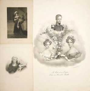 DUCHESSE DE BERRY ET HENRY V. 3 GRAVURES : «La Veuve et ses enfants dédié aux amis de la Famille.» Lithographie de Ligny et Dupaix, 38 Rue Quincampoix. (49 x 34) + Gravure (27 x 17) de la Duchesse de Berry, en deuil. Pauquet del. Frilley sc. + Gravure (27 x 17) «duchesse de Berry» tenant son fils. Impr. de Drouard, 11 rue du Fouarre Paris.