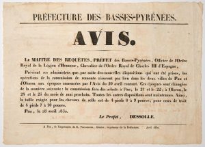 PAU (64) 28 Avril 1830. Avis de DESSOLLE Maître des Requêtes, Préfet des Basses-Pyrénées. Il prévient ses Administrés que la Commission de Remonte fera des achats de chevaux à PAU, le 21 et le 22 et à OLÉRON le 24 et 25 du mois de mai prochain... Ainsi la taille des chevaux de selle est de 4 pieds 8 à 9 pouces ; pour celle de trait de 4 pieds 7 à 10 pouces. - Impr. à PAU, chez E. VIGNANCOUR, Libraire, Imprimeur de la Préfecture. Avril 1830 - Placard (32 x 44) Etat A