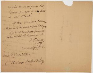 Lettre de Paris ce 1er Avril 1832, à Alexandre BAUDET-DULARY Médecin, Député de Seine-et-Oise de 1831 à 1834, siégeant à gauche proche de Fourier, il se consacre ensuite au développement des idées phalanstériennes. 2pp in-8° - «J'ai prié Lundi dernier M. BAUD de passer chez vous pour savoir si vous vouliez échanger l'inscription de rente Saint-simonienne, que vous avez, contre une nouvelle signée Michel CHEVALIER ; il m'a dit que vous aviez remis cette inscription pour être annulée. Hier cependant on s'est présenté à notre caisse pour toucher le coupon d'intérêt qui échoit au 1er Avril ; sur la foi de votre réponse j'ai refusé de l'acquitter. Serait-ce abuser de votre complaisance que de vous prier de me confirmer la réponse que vous avez faite à Mr BAUD ?..»
