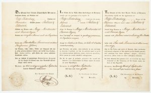 ALLEMAGNE. PATENTE DE SANTÉ délivrée par le Sénat de la Ville Hanséatique de BREMEN pour se rendre à MAYO, MONTÉVIDÉO et BUENOS AYRES du 23 Septembre 1834. Texte trilingue Français, Allemand, Anglais. Formulaire impr. rempli à l'encre (23 x 38,5) «... que Bremen et ses ports, son territoire et ses environs se trouvent à présent en état de parfaite santé et qu'ils n'y existent aucune épidémie, peste, choléra morbus, fièvre jaune ou autres maladies contagieuses...»