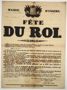 MAINE-ET-LOIRE. 1835. BALLON. “MAIRIE D'ANGERS. FÊTE DU ROI.” ANGERS 26 Avril 1835 - Dispositions du Maire de la Ville d'ANGERS pour célébrer la fête du Roi. “Le 30 avril, à 6 h. une Salve de 21 coups de canon annoncera la fête du lendemain. Le 1er mai de la Saint-Philippe nouvelle Salve... Distribution de pain... Grande Revue de la Garde Nationale et des Troupes de la garnison... ouverture des danses publiques... Exercices de funambules, terminés par l'Ascension d'un BALLON, et quelques pièces d'artifice... Illumination des Édifices publics...” - Vignette . Impr. à ANGERS, chez ERNEST LE SOURD. Affiche (61 x 45) État A.