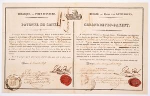 BELGIQUE. PATENTE DE SANTÉ délivrée par le PORT D'ANVERS (Belgique) pour se rendre à MONTÉVIDÉO & BUENOS AYRES, du 31 Août 1837. Texte bilingue Français, Flamand. Vignette. Formulaire impr. rempli à l'encre (23,5 x 38). «... à l'effet de constater l'état sanitaire de l'Équipage et Passager, je déclare que ni le choléra-morbus, ni aucune maladie épidémique ou contagieuse, ne règnent à Anvers et ses environs.»