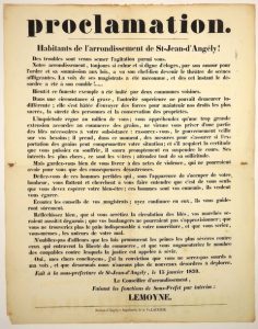 ST JEAN D'ANGELY (17). 1839. AGITATION. GRAINS. «Des troubles sont venus semer l'agitation parmi nous. Notre Arrondissement ... a vu son chef-lieu devenir le théâtre de scènes affligeantes. La voix de ses Magistrats a été méconnue, et dès cet instant le désordre a été à son comble. Bientôt ce funeste exemple a été imité par deux communes voisines. Dans une circonstance si grave, l'autorité supérieure ne pouvait demeurer indifférente. ; elle s'est hâtée d'envoyer des forces pour maintenir nos droits les plus sacrés, la sureté des personnes et la conservation des propriétés. L'inquiétude règne au milieu de vous ; vous appréhendez qu'une trop grande extension accordée au commerce des grains, ne vienne vous priver d'une partie des blés nécessaires à votre subsistance : rassurez-vous, le gouvernement veille sur vos besoins ...» Le Conseiller d'arrondissement faisant les fonctions de Sous-préfet par intérim : LEMOYNE - Impr. à St-Jean-d'Angély, chez la veuve Lacurie - Affiche (55 x 43) État A.