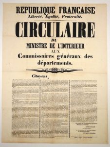 AUTUN (71). 1848. «République Française. Circulaire du Ministre de l'Intérieur aux Commissaires généraux des départements.» LEDRU-ROLLIN, membre du Gouvernement provisoire, Ministre de l'Intérieur. «Nous touchons aux élections : encore quelques jours le peuple français tout entier, usant de sa souveraineté si glorieusement reconquise, proclamera le nom de ses mandataires. A la veille de ce grand acte de sa toute puissance, il est utile que le Gouvernement né de la Révolution, chargé de conserver intacte et pure la victoire populaire, expose une dernière fois sa pensée à ceux qui le représentent et le défendent sur toute la surface de la République...» - Impr. à AUTUN, chez Michel Jussieu. Affiche (65 x 49) État A.