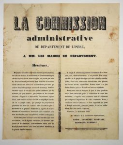 ISÈRE. (RÉVOLUTION DE FÉVRIER 1848). GRENOBLE, le 28 Février 1848 - Adresse de la Commission administrative de l'Isère (CREPU, THEVENET, REPELLIN, LEBORGNE, CLEMENT) pour confirmer leur fidélité au nouveau Gouvernement «...Ce Gouvernement précurseur d'un véritable Gouvernement national est salué avec acclamations...C'est pour la France une ère nouvelle qui vient de s'ouvrir, ère de dignité extérieure, de moralité intérieure et de fraternité...Il s'agit de célébrer dignement l'avènement de ce beau jour, qui, malheureusement, a été précédé d'un orage terrible, où le peuple héroïque de Paris a fait de cruelles pertes...» - Impr. Grenoble Typo F. ALLIER père & fils - Affiche (44 x 56) État C.