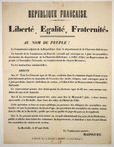 CHARENTE-MARITIME. LA ROCHELLE, le 27 mai 1848. Arrêté du Commissaire-adjoint MAINGUET convoquant au 4 juin les assemblées électorales du Département de la CHARENTE-INFERIEURE, à l'effet d'élire un Représentant du Peuple à l'Assemblée-Nationale en remplacement du Citoyen BETHMONT - LA ROCHELLE. Typo. De DAUSSE et A. SIRET, rue Grosse Horloge, 6 - Affiche (56 x 43) État A
