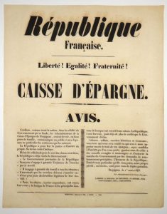 PYRÉNÉES ORIENTALES. 1848. «RÉPUBLIQUE FRANÇAISE. LA CAISSE D'ÉPARGNE » de PERPIGNAN (66). Avis des Administrateurs de la Caisse d'Épargne, PERPIGNAN (66) le 1er Mars 1848. «... Le Gouvernement provisoire de la République s'engage à garantir l'existence de l'ouvrier par le travail. Il s'engage à garantir du travail à tous les citoyens ; il reconnaît que les ouvriers doivent s'associer entr'eux pour jouir des bénéfices légitimes de leur travail...» - Impr. de Melle A. Tastu à Perpignan, 1848. Affiche (56 x 44) État A.