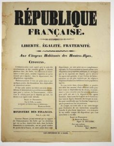 HAUTES-ALPES. 1848. DÉFORESTATION. ADRESSE Aux Citoyens Habitants des Hautes-Alpes du Conseiller de Préfecture M. BLANC-LE-JEUNE chargé de l'Administration pour le préfet en tournée à propos de dilapidations et des dévastations des forêts publiques dans le département - Suivi de la lettre du Ministre des Finances E. DUCLERC invitant les préfets à prendre des mesures radicales - PARIS, le 2 juin 1848 - GAP, Impr. De A. ALLIER - Affiche (56 x 44) Etat B