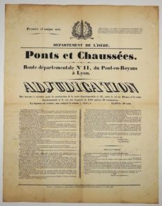 ISÈRE. GRENOBLE 25 Juillet 1848. PONTS-ET-CHAUSSÉES : «Route départementale n°11, du Pont-en-Royans à Lyon. Adjudication des travaux à exécuter pour la construction de la route départementale n°11, entre le Col de Diémoz et la route départementale n°8, sur une longueur de 1563 mètres...» Le Préfet de l'Isère Ferd. REYMOND - Vignette «République Française» - Impr. F. Allier, père et fils, à Grenoble.