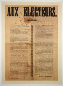 Adresse du Général MONTHOLON, «Aux Électeurs». «Des ambitions personnelles s'attaquent avec acharnement à LOUIS NAPOLÉON BONAPARTE pour repousser sa Candidature... LOUIS NAPOLÉON est Français... Pour la Mémoire de l'Empereur Napoléon 1er... J'ai partagé les sept ans de captivité qu'il a enduré dans la forteresse de HAM...» (Décembre 1848) - Impr. de Mme Lacombe, 12 rue d'Enghien. Affiche (60 x 41) État B, Entoilée.
