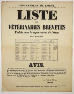ORNE. 1849. “LISTE des VÉTÉRINAIRES Brevetés établis dans le Département de l'ORNE, au 1er Janvier 1849.” (en Tableau: Nom, résidence, date du diplôme, École d'Alfort) - suivi de l'Avis du Préfet de l'Orne VISINET, ALENÇON 16 mars 1849 - concernant les Propriétaires de chevaux ou bestiaux qui prétendent à l'indemnité pour pertes de bestiaux morts d'épizootie. Affiche (46 x 37) État A.