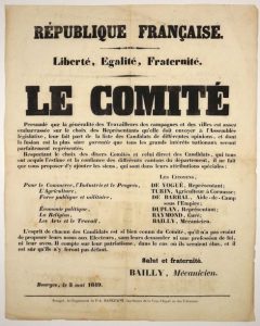 CHER. «LE COMITÉ» (D'UNION NATIONALE). BOURGES le 3 mai 1849 - «Le Comité... fait part de la liste des Candidats de différentes opinions (Représentants qu'il doit envoyer à l'Assemblée Législative.) et dont la fusion est la plus sûre garantie que tous les intérêts nationaux seront parfaitement représentés... : DE VOGUÉ Représentant, TURIN Agriculteur à Cornusse, DE BARRAL Aide de Camp sous l'Empire, DUPLAN Représentant, RAYMOND Curé, BAILLY Mécanicien.» - Impr. à BOURGES, chez P.-A. Manceron, Imprimeur de la Cour d'appel et des tribunaux. Affiche (55 x 44) État B.