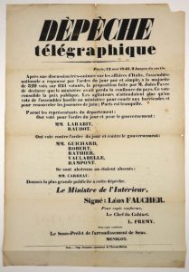 YONNE. DÉPÊCHE TÉLÉGRAPHIQUE signé Léon FAUCHER Ministre de l'Intérieur - Paris, 12 mai 1849, 9 heures du matin. "Après une discussion très animée sur les affaires d'Italie (Campagne de ROME), l'Assemblée Nationale a repoussé par l'ordre du jour pur et simple, à la majorité de 329 voix sur 621 votants, la proposition faite par M. Jules FAVRE de déclarer que le ministère avait perdu la confiance du pays. Ce vote consolide la Paix Publique. Les agitateurs n'attendaient plus qu'un vote de l'Assemblée hostile au ministère pour courir aux barricades et pour renouveler les journées de juin; Paris est tranquille...Parmi les Représentants du Département (de l'YONNE): Ont voté pour MM. LARABIT, RAUDOT; Ont voté contre MM. GUICHARD, ROBERT, RATHIER, VAULABELLE et RAMPONT..." - à SENS, Impr. DUCHEMIN, successeur de Thomas-Malvin. Affiche (45x62) Etat A.