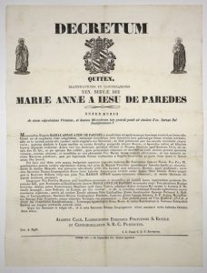 (SAINTE MARIE-ANNE DE PAREDES) ROME 1850 - Décret de la BEATIFICATION & CANONISATION DE MARIE-ANNE DE PAREDES - Pièce en latin avec vignette de Saints - ROME 1850, Impr. TYP. Rev. CAMERA APOSTOLICAE - [MARIE-ANNE DE PAREDES (Mariana De Jésus Paredes y Flores) SAINTE, contemplative équatorienne (Quito 1618-id. 1645) Estimant qu'elle n'était pas faite pour la vie commune, elle s'astreignit à vivre, chez elle, comme les religieuses contemplatives. Canonisée en 1850 par PIE IX; Fêté le 26 mai) - Affiche (57 x 44) État A.