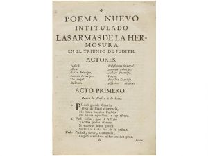 1753. (TEATRO). REINES, JUAN: POEMA NUEVO INTITULADO LAS ARMAS DE LA HERMOSURA EN EL TRIUNFO DE JUDITH. [Palma]: Oficina de la Viuda Frau, impresora de la Real Audiencia, 1753. 8° mayor. 40 p. Cubiertas originales en papel estampado a dos colores....