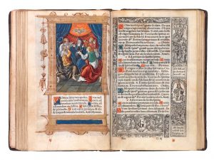 Toutes les figures, grandes comme petites, ont été soigneusement miniaturées, avec rehauts de blanc et de doré ; les grandes ont été agrémentées d'encadrements manuscrits à fond d'or ; les initiales du texte sont rubriquées à l'or sur fond rouge, bleu ou bicolore.