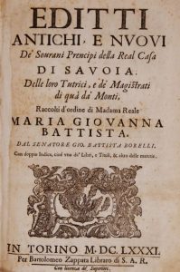 BORELLI (Giovanni Battista). Editti antichi, e nuovi de' sovrani prencipi della real casa di Savoia, delle loro tutrici, e de' magistrati di quà da' monti. Turin, Bartolomeo Zappata, 1681. 2 volumes in-folio, vélin rigide, dos lisse, tranches rouges (Reliure de l'époque). Édition originale de ce rare et important corpus juridico-administratif des anciens États de Savoie.