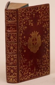 ALMANACH ROYAL, année 1745. Paris, veuve d'Houry, 1745. In-8, maroquin rouge, triple filet doré, riche dentelle aux petits fers dorés, armoiries au centre et aux angles, dos lisse orné des mêmes armes répétées, dentelle intérieure, tranches dorées (Reliure de l'époque). Exemplaire en maroquin à dentelle aux armes du duc de Richelieu.