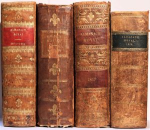 ALMANACH ROYAL. Ensemble 34 volumes. Paris, Testu [puis] Gayot, [1814 -1850]. 34 volumes in-8, 3 en maroquin rouge, veau fauve ou percaline (Reliure de l'époque). Riche ensemble d'almanachs dits d'abord "royaux" sous Louis XVIII et Charles X puis "royaux et nationaux" sous Louis-Philippe d'Orléans.