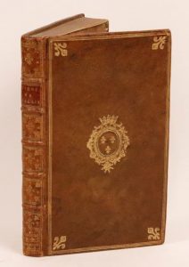 BELLOY (Pierre Laurent de). Le Siège de Calais, tragédie. Paris, Duchesne, 1765. In-8, maroquin olive, triple filet doré, fleurs de lis aux angles, armoiries au centre, dos orné de fleurs de lis dorées, dentelle intérieure, gardes de papier doré, tranches dorées (Reliure de l'époque). Édition originale, dédiée au roi.