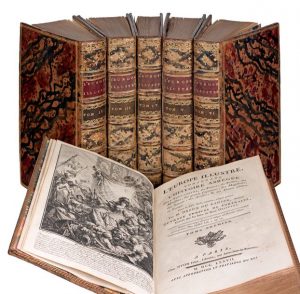 DREUX DU RADIER (Jean-François). L'Europe illustre, contenant l'histoire abrégée des souverains, des princes, des prélats, des ministres, des grands capitaines, des magistrats, des savans, des artistes, & des dames célèbres en Europe, dans le XVe siècle compris, jusqu'à présent. Paris, Nyon l'aîné, 1777. 6 volumes grand in-8, veau marbré veiné de vert, triple filet doré, dos orné, dentelle intérieure, tranches dorées (Reliure de l'époque). Remise en vente à l'adresse de Nyon de ce bel ouvrage publié pour la première fois par Odieuvre et Le Breton entre 1755 et 1765.