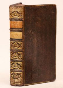 EUCLIDE. Τα σωζόμενα. Quæ supersunt omnia. Oxford, Sheldonian Theatre, 1703. In-folio, veau granité, double encadrement d'un filet gras doré et d'une roulette à froid avec fleurons aux angles internes et externes, dos orné de grandes couronnes dorées, tranches rouges (Reliure anglaise de l'époque). Édition gréco-latine publiée et annotée par David Gregory.