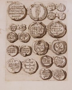 FICORONI (Francesco de). I Piombi antichi. Rome, Girolamo Mainardi, 1740. In-4, vélin rigide, dos lisse, cartouche de titre teinté, tranches jonquille (Reliure italienne de l'époque). Édition originale de ce traité sur les sceaux et médailles de plomb antiques.