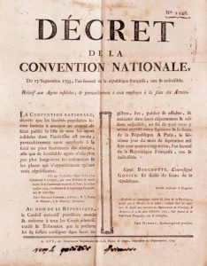15 placards de décrets de la Convention nationale imprimés à Avignon en 1793. Décret de la Convention nationale qui défend la vente, cession... des titres actuels constatant les Créances non-viagères sur la Nation... 11 septembre 1793, an II. – Décrets..., sur les Citoyens appelés aux fonctions de juré d'accusation... 3 juin 1793. – Décrets... relatif à la prise de Toulon. 4e jour de Nivose, an II. 2 exemplaires. – Décrets..., sur les pièces à produire contre les Députés mis en arrestation... 31 mai 1793. – Décrets... n°1513, 1514 et 1521. Septembre 1793. 2 exemplaires. – Décrets... relatif aux dates des Actes publics, aux vacances des Administrations et des Tribunaux & au Millésime des monnoies. 16e jour du 1er mois de l'an II. – Décrets... sur le mode d'exécution de la loi qui met les citoyens de 18 à 25 ans en état de réquisition. 1er et 2 octobre 1793, an II. 3 exemplaires. – Décrets... qui ordonne un Inventaire des Marchandises ouvrées ou non ouvrées dans tous les magasins de la République. 2 octobre 1793. 4 exemplaires.