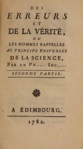 [SAINT-MARTIN (Louis-Claude de)]. Des erreurs et de la vérité, ou les hommes rappelés au principe universel de la science. Par un Ph[ilosophe] Inc[onnu]. Édimbourg, s.n., 1782. 2 volumes in-12, basane marbrée, dos orné, tranches rouges (Reliure de l'époque). Première œuvre philosophique de Saint-Martin, « écrite par désœuvrement et par colère contre les philosophes », Des erreurs et de la vérité est une réfutation fondée sur la théorie gnostique de l'émanation des théories sociales d’Helvétius et de Rousseau et de la doctrine matérialiste de Condillac.