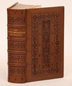 BALZAC (Honoré de). Les Contes drolatiques colligez ez abbayes de Touraine. Cinquième édition. Paris, Société générale de la librairie, 1855. In-8, maroquin brun estampé, plaque à froid dans le style Renaissance, dos orné de même, quadruple filet intérieur, doublures et gardes de vélin blanc, tranches dorées, étui bordé (Marius Michel). Quatrième édition de ce fameux pastiche rabelaisien, annoncée à tort comme la cinquième. L'originale a vu le jour chez Gosselin et Werdet entre 1832 et 1837.