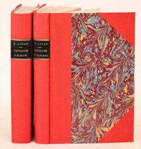 LUCAS (Hippolyte). Histoire naturelle des lépidoptères d’Europe. – Histoire naturelle des lépidoptères exotiques. Paris, Pauquet, L. Debure, 1834-1835. 2 volumes in-8, bradel demi-percaline rouge avec coins, non rogné, couverture (Reliure du début du XXe siècle). Éditions originales.