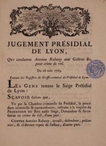 [RECUEIL DE PIÈCES]. Documents sur Lyon. Lyon, Pierre Valfray, e.a., 1766-1772. 33 pièces en un volume in-4, bradel demi-vélin blanc (Reliure moderne). Recueil factice réunissant 33 arrêts du Conseil d’État et de la Cour des monnaies, lettres-patentes, ordonnances et jugements du lieutenant-général, de la sénéchaussée, du prévôt ou du présidial de Lyon, faisant état de nombreuses condamnations aux galères, de décisions sur la voierie, la milice, la fiscalité, etc.