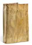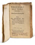 Clarissimo viro, et aetatis nostrae doctissimo, D. Joachimo Camerario, Th. Beza Vezelius consecravit » [Théodore de Beze dédicace [ce livre] à D. Joachim Camerarius, l’homme le plus fameux et érudit de notre temps]. Reliure de l’époque : vélin souple à rabat, dos lisse, titre à l’encre, passé, tranches anciennement dorées ( grand de marges, quelques rousseurs sans gravité