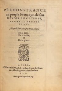 ++Remonstrance au peuple françoys de son devoir en ce temps, envers la maieste du roi. A laquelle sont adjoustez troys Eloges, de la paix, de la trefve, et de la guerre.