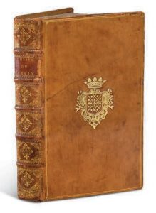 In-8 (165 x 104 mm). Portrait de l’auteur attribué à Nicolas Denisot, bandeaux, lettrines et culs-de-lampe gravés. Reliure du XVIIIe siècle : veau blond, armes dorées au centre des plats, frappées postérieurement, filets dorés d’encadrement des plats, dos à nerfs, caissons ornés, pièce de titre de maroquin blond, tranches dorées (
