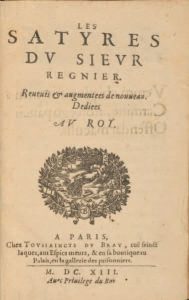 RÉGNIER, Mathurin (1573-1613). ++Les Satyres du Sieur Régnier. Reveues & augmentées de nouveau. Dédiées au Roy