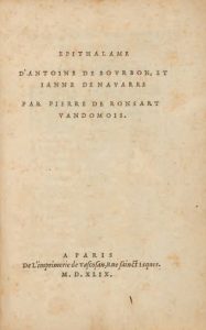 RONSARD, Pierre de (1524-1585). ++Epithalame d’Antoine de Bourbon, et Ianne de Navarre par Pierre de Ronsard Vandomois.