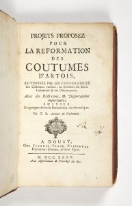 [ARTOIS / COUTUMES - BRUNEL (T.)]. — Projets proposez pour la reformation des coutumes d'Artois […]. — A Douay, Chez Jacques François Willerval, 1735. — In-8°, veau, dos à nerfs orné (reliure de l'époque).
